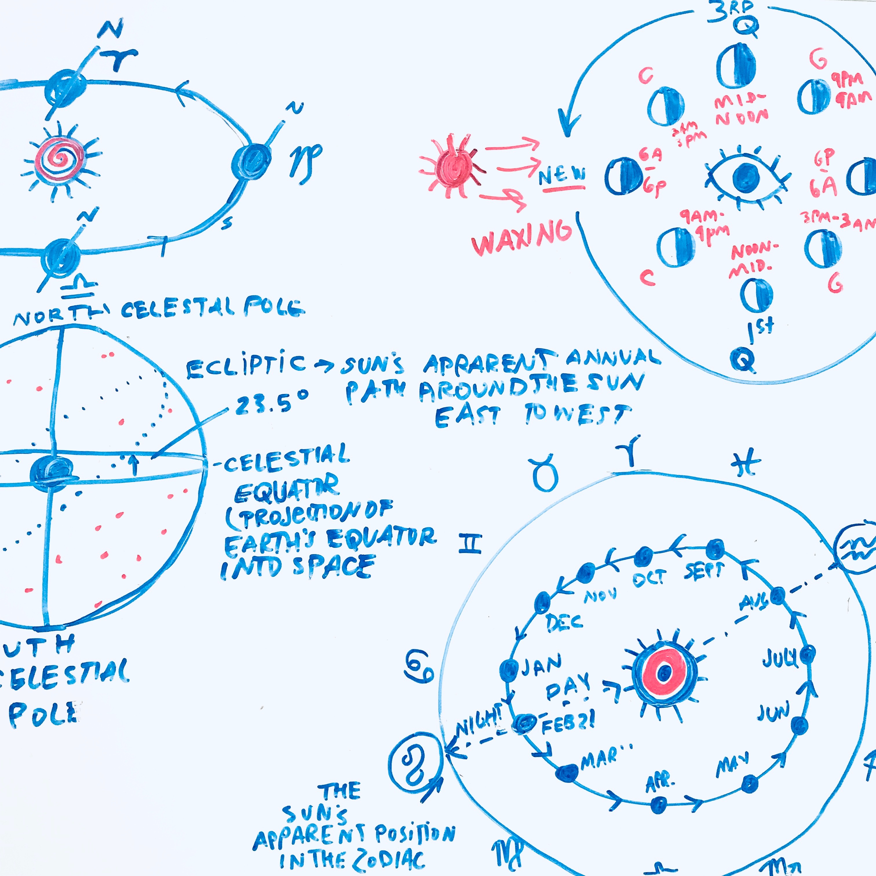 Practical Astronomy for Time Keeping is a workshop developed to accompany the calendar project, Time as Lover. The initial intention of the workshop was to help people navigate the annual circular calendars that accompany this project. These calendars are a variation of the Gregorian calendar and intend to spatially situate the viewer in relation to celestial bodies. In order to understand the calendars, participants are provided with basic knowledge of astronomy that can be useful in telling time— be it seasonal time, or time relative to sunrise and sunset, and moonrise and moonset. The information is also useful in orienting oneself with the cardinal directions using celestial bodies.